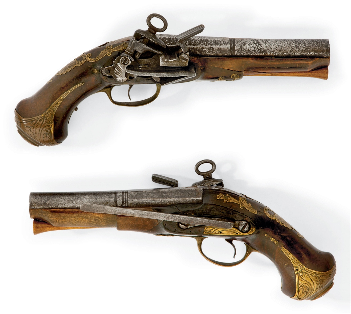 "praemonitus praemunitus" (вот как раз испанские карманные пиштолии примерно того периода: http://www.christies.com/lotfinderimages/d54048/d5404832a.jpg )